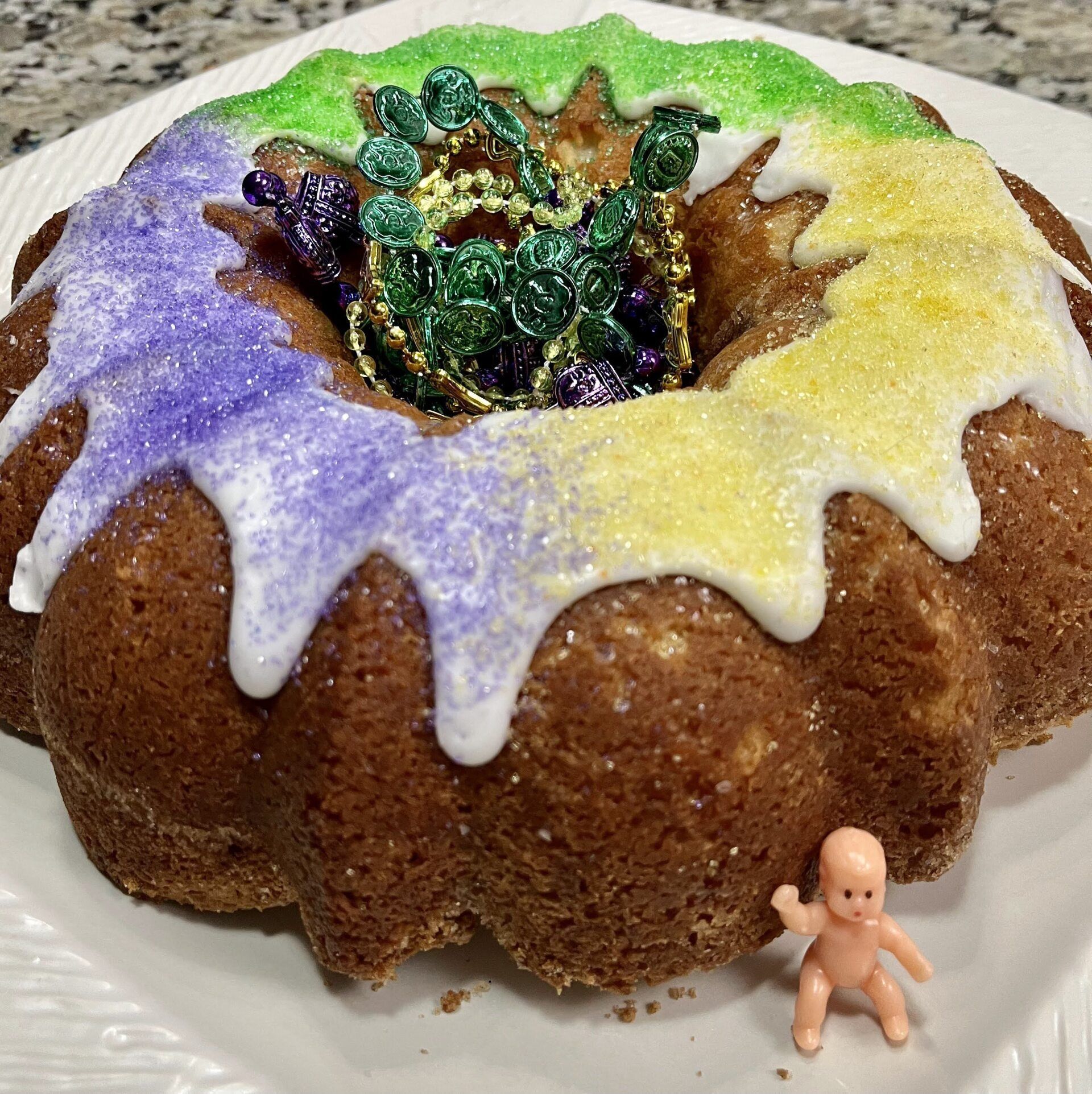 - A moist, buttery cake with a slightly crispy outer crust and two layers of cinnamon, sugar, and walnut streusel. Topped with powdered sugar glaze and gold, purple and green edible sugar on top. Optional: jelly bean or 1" plastic baby hidden inside (caution: choking hazard) and Mardi Gras beads.